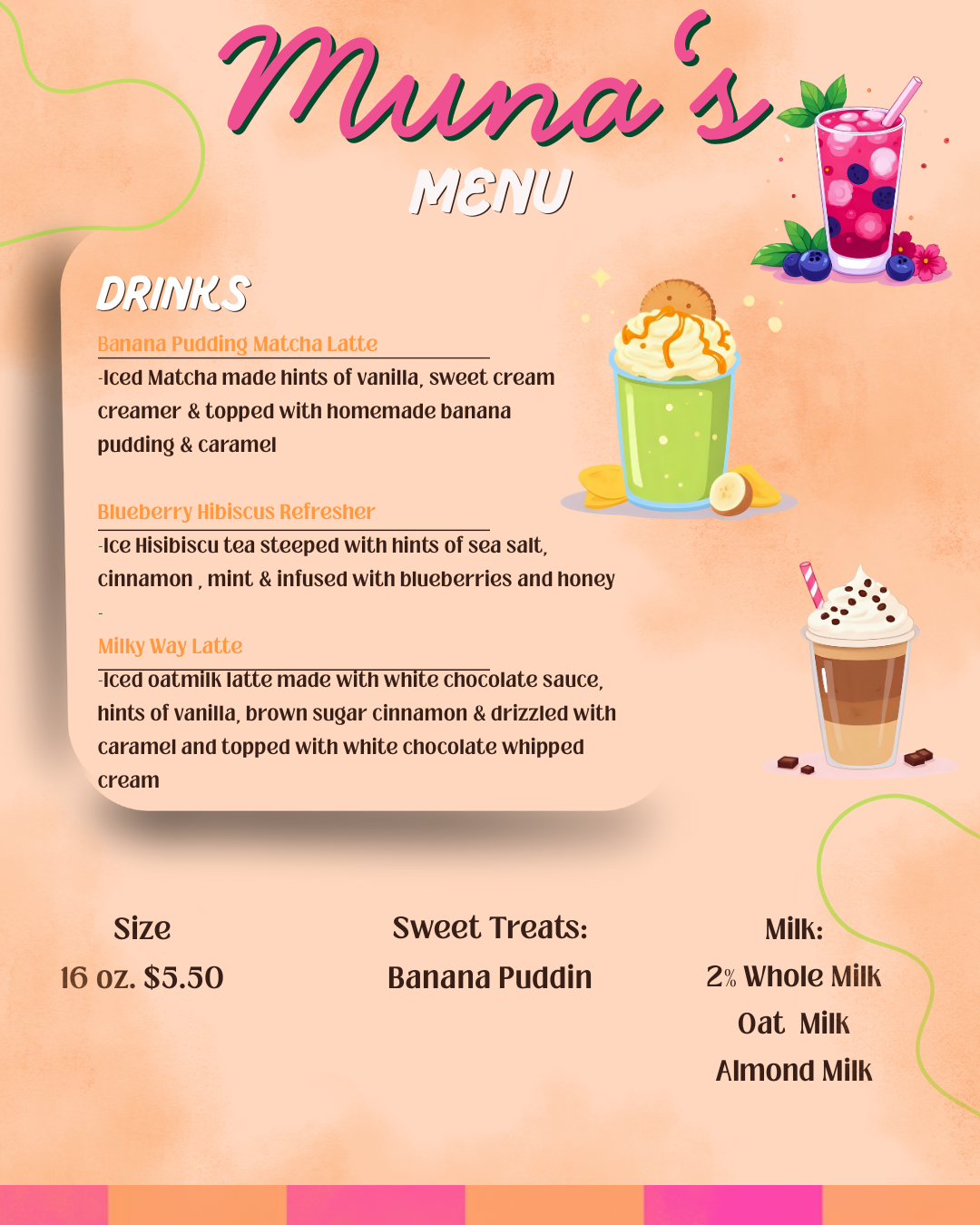 Iced matcha latte blended with hints of vanilla and creamy sweet cream, topped with our homemade banana pudding and a drizzle of caramel. A dessert in a cup that’s perfect for matcha lovers.